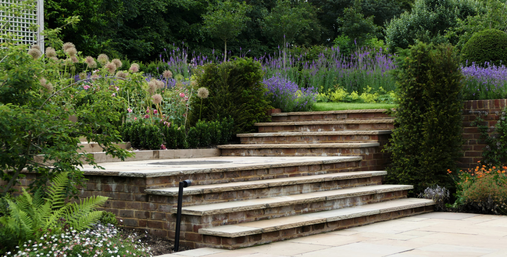 We designed and built this large country garden in Hertfordshire – rearranging the challenging levels of the raised terraces and making them feel more connected to the rest of the garden. The garden takes on a more traditional country style, teamed with clean lines and meticulous planting. You’ll find traditional bedding plants such as lavender and roses teamed with bright pops of colour, adding vibrancy to the space. We designed the landscape so that the views beyond have been beautifully framed by native trees whilst a semi-circular rose garden has been revitalised with new cultivars and topiary.